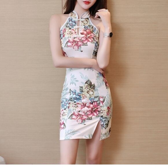 チャイナドレス ドレス チャイナワンピース ミニ丈 ショートドレス 新作 レトロ風 フラワープリント 花柄 シック モダン ちょいセクシー 大人可愛い セクシーチャイナドレス 海外デザイン インポートファッション インスタ映え 映える パーティー 二次会 結婚式 ウエディング 衣装 ナイトクラブ 特別な日 ディナー 誕生日 中国風 気質 ホルターネック オープンバック タイトバッグ ヒップ タイト ワンピースタイト 美脚 デコルテ 大人クール スタイリッシュ オトナモード トレンディ 海外風 人気デザイン