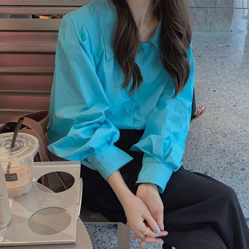 ブラウス ポップシャツ カジュアル パフ袖 パフスリーブ ゆったり目 ブルー 青 きれいめシャツ おしゃれ シック シャツ女性 デザイン重視 センス ニッチ 新作 新しい ルーズ 薄い ウィンドレイク ブルーシャツ 普段使い デイリー使い 着回し 重ね着 ラクチンコーデ 楽々 お出かけ 旅行 ドライブ デート 人気デザイン 大人きれい 大人女子 韓国デザイン オルチャン 海外ファッション 外国風デザイン ホットアイテム おススメ S M L モダン 綺麗女子 OL 通勤 学生 通学 公園 カフェ お散歩