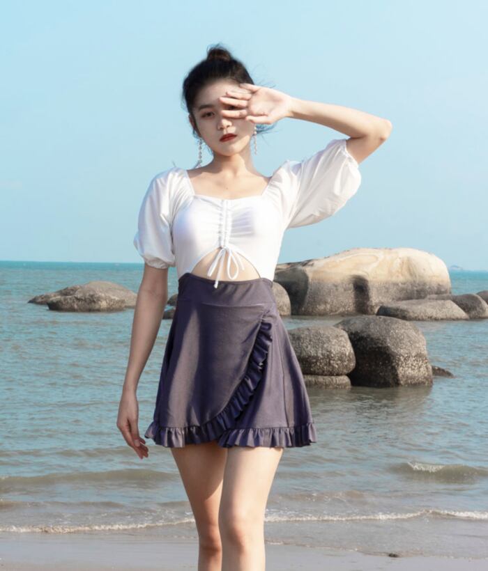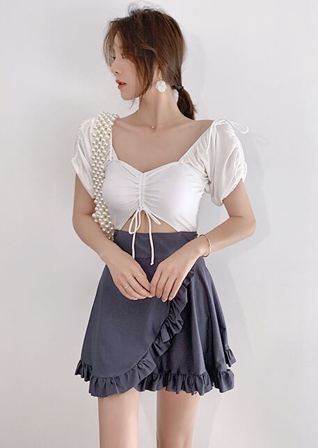 水着 レディース セットアップ ワンピース スイムウェア ミニスカート 袖あり 半袖 フリル ハーフパンツ 2点セット スクエアネック 白 ホワイト 灰色 グレー かわいい 大人可愛い 大人 大人女子 きれいめ おしゃれ お洒落 シンプル ラブリー キュート ガーリー フェミニン 10代 20代 30代 学生 デート お出かけ 女子会 休日 普段使い カジュアル こなれ感 抜け感 穴あき モテ ラフ ルーズ ゆったり ゆる 夏 リゾート 海 ビーチ プール セクシー 可憐 華やか パーティー イベント