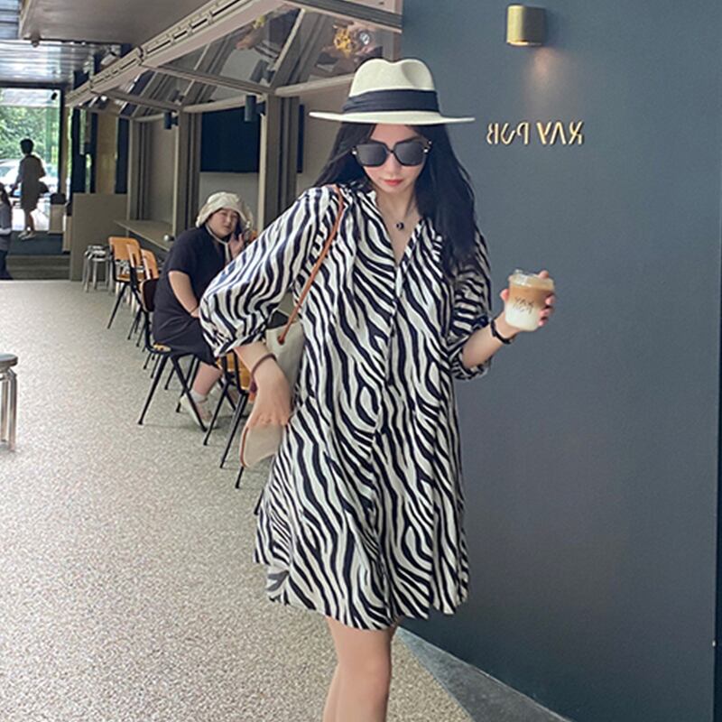 ゼブラ柄ワンピース レディース 長袖 バルーンスリーブ パフスリーブ 八分袖 大人ワンピ 前開き フロントボタン Vネック 総柄 シマウマ柄 黒白 モノトーン ひざ丈ワンピ ゆったり 大きめサイズ ゆったりサイズ リゾート 休日 リラックス 大人女子 クール かっこいい サファリルック 旅行 避暑地 普段使い お出かけ 夏服 ショッピング カジュアル ラグジュアリー 大人っぽい 簡単コーデ 主役級 エレママ 韓国ファッション インポート服 プチプラ お買い得 低価格 20代 30代 40代 サイズ豊富