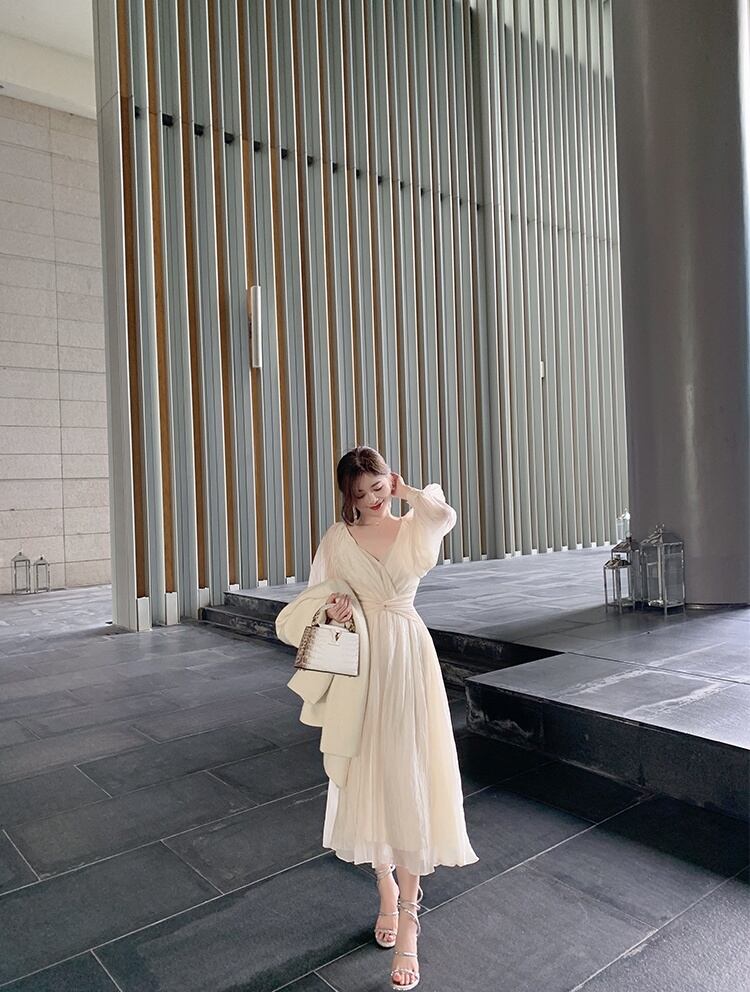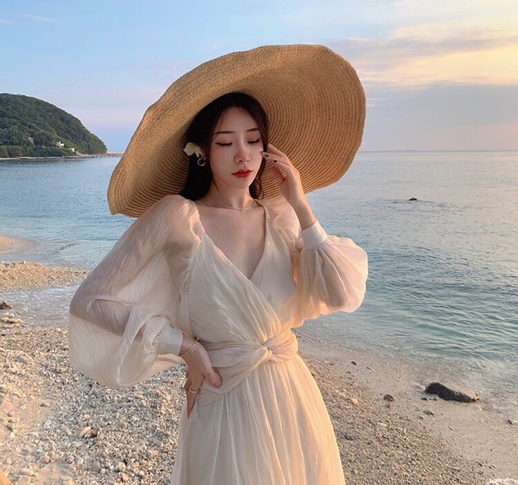 ワンピース ドレス レディース 女性用 長袖 バルーン袖 フレア袖 Vネック ロング丈 マキシ丈 薄手 Aラインスカート レトロ 大人可愛い カジュアル 大人カジュアル かわいい ガーリー おしゃれ かっこいい 大人女子 甘め メンズライク レディライク レース リボン ベルト 単色 ベージュ オフホワイト 夏 お出かけ デート 休日 リゾート お呼ばれ 韓国ファッション トレンド OL 学生 10代 20代 30代 個性的 人気 エレガンス シンプル ラフ こなれ感 透け感 シースルー ハイウエスト