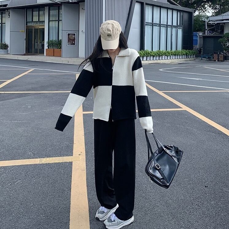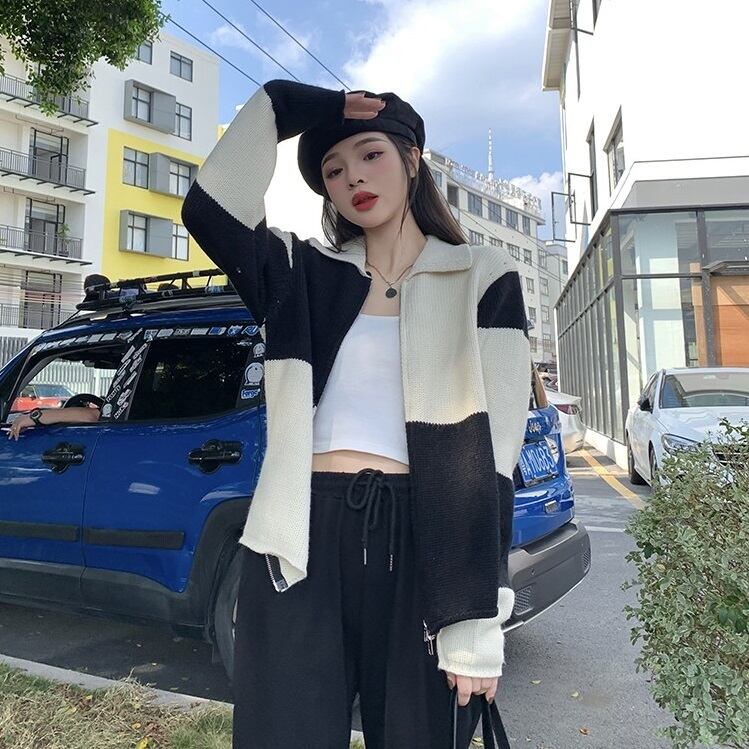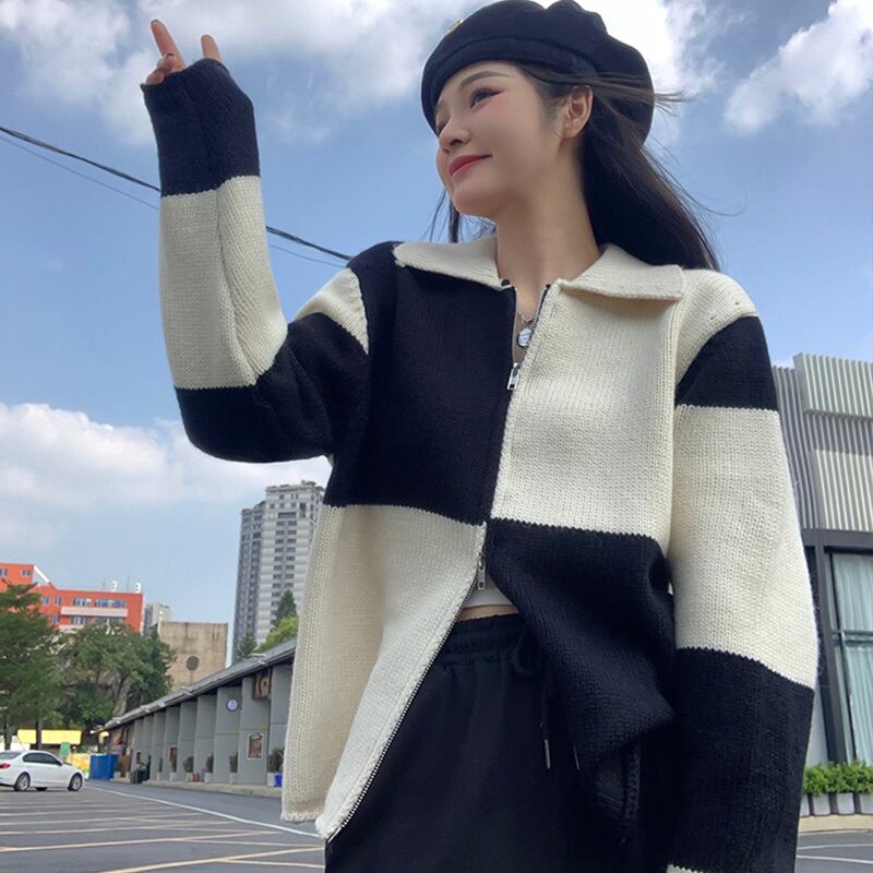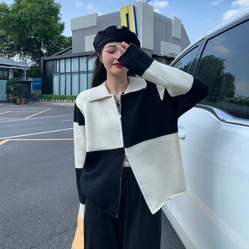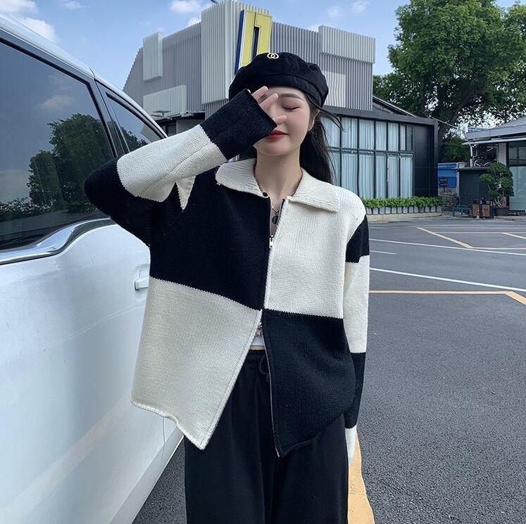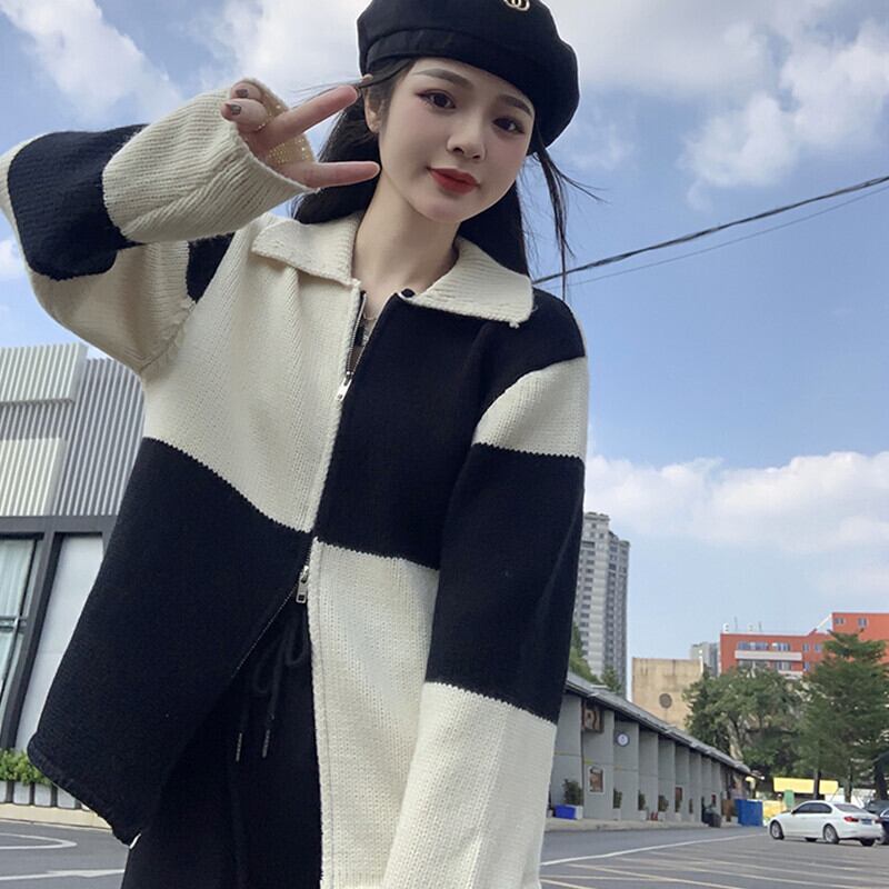 格子柄ニット アウター レディース 長袖 カーディガン フロントジッパー 前開き 襟付き レギュラーカラー 黒白 モノトーン マス目 ブロック柄 大きめサイズ ゆったり ゆったりサイズ サイズ豊富 かっこかわいい おしゃれ クール 大人っぽい 格上げアイテム ニットアウター 春秋 羽織り物 通勤 通学 デート アウトドア 旅行 普段使い 幼稚園送迎 ショッピング お出かけ モダン レトロモダン スタイリッシュ 着まわせる 簡単コーデ 韓国ファッション 大人女子 大人 低価格 プチプラ インポート L XL