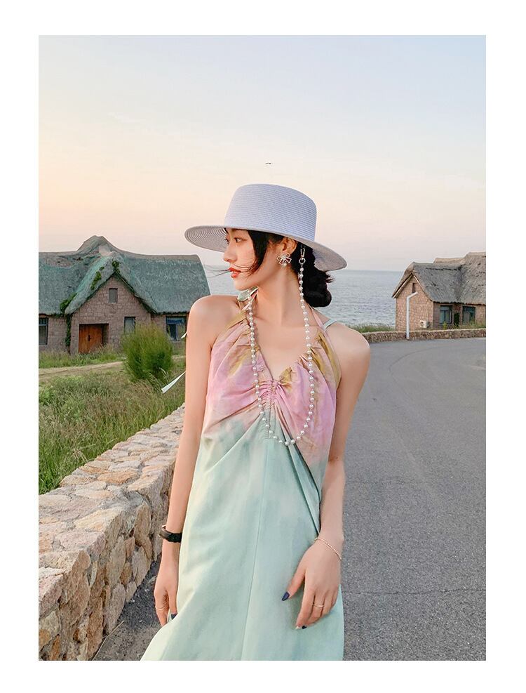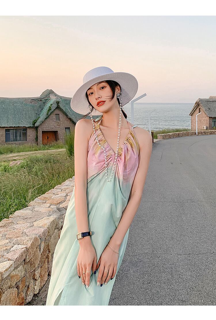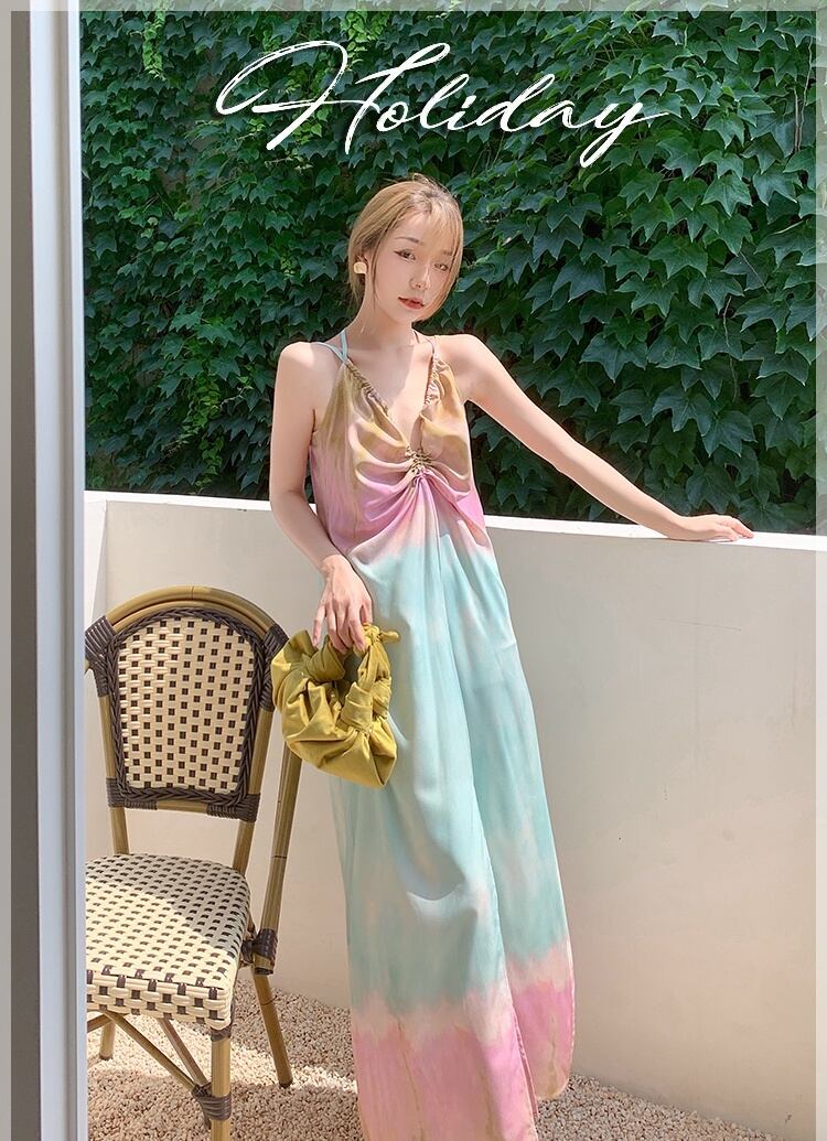 ワンピース ドレス レディース 女性用 ノースリーブ キャミソール 首掛け ロング丈 マキシ丈 薄手 ボヘミアン レトロ 大人可愛い カジュアル 大人カジュアル かわいい ガーリー おしゃれ かっこいい 大人女子 甘め メンズライク レディライク 紐 くしゅくしゅ グラデーション カラフル 黄 イエロー 桃 ピンク 青 ブルー 夏 お出かけ デート 休日 リゾート お呼ばれ 韓国ファッション トレンド OL 学生 10代 20代 30代 個性的 人気 シンプル ラフ こなれ感 透け感 スリッド セクシー