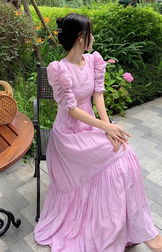 ワンピース ドレス レディース すみれ 新作 人気 カラードレス 半袖 ロング丈 マキシ丈 バルーン袖 丸襟 紐 編み上げ 薄手 Aラインスカート ボタン レトロ 大人可愛い カジュアル 大人カジュアル かわいい ガーリー おしゃれ かっこいい 大人女子 メンズライク レディライク リボン 単色 紫 バイオレッド 春 夏 お出かけ デート 休日 リゾート お呼ばれ 韓国ファッション トレンド OL 学生 10代 20代 30代 個性的 人気 くしゅくしゅ シンプル ラフ こなれ感 ハイウエスト セクシー