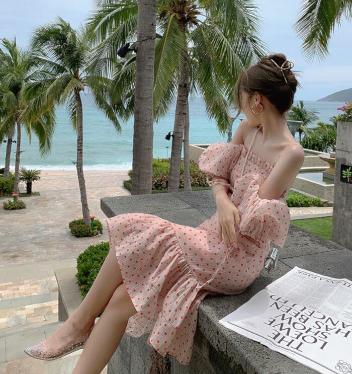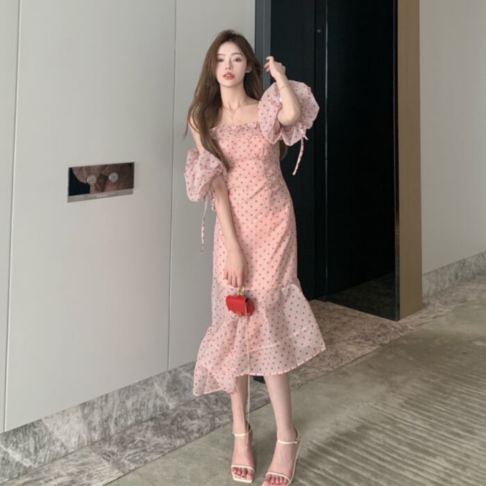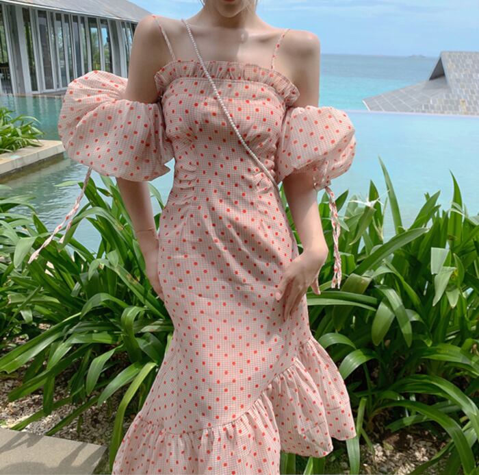 ワンピース レディース キャミワンピース ロングスカート マーメイド ミモレ丈 袖あり アームドレス フィッシュテール ドット 水玉 透け感 フリル ピンク かわいい 大人可愛い 大人 大人女子 きれいめ おしゃれ お洒落 シンプル ラブリー キュート ガーリー フェミニン 10代 20代 30代 学生 通学 デート お出かけ 女子会 休日 普段使い カジュアル こなれ感 抜け感 スリム 細身 ラフ ルーズ ゆる リゾート 海 プール セクシー 可憐 カラフル 華やか インパクト パーティー イベント