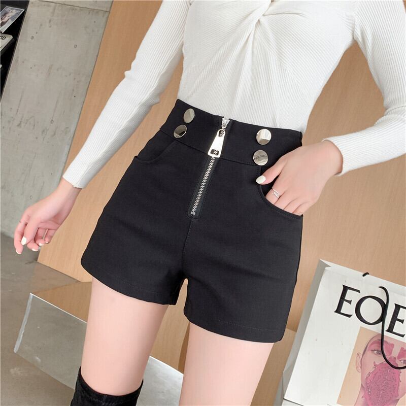 ショートパンツ レディース 黒 無地 ハイウエスト ジッパー マイクロミニ 飾りボタン ティーンズ カジュアル ブラック 脚長効果 ストレッチ サイズ豊富 クール おしゃれ 可愛い かっこかわいい トレンド 人気 オルチャン スタイリッシュ スタイルアップ アクティビティ デート 旅行 ドライブ 学生 夏服 夏 休日 夏休み 韓国ファッション ヒップアップ 着まわせる 簡単コーデ プチプラ 低価格 かわいい 定番 半ズボン ミニ ボーイッシュ マニッシュ マリンスタイル 大きめサイズ S M L XL