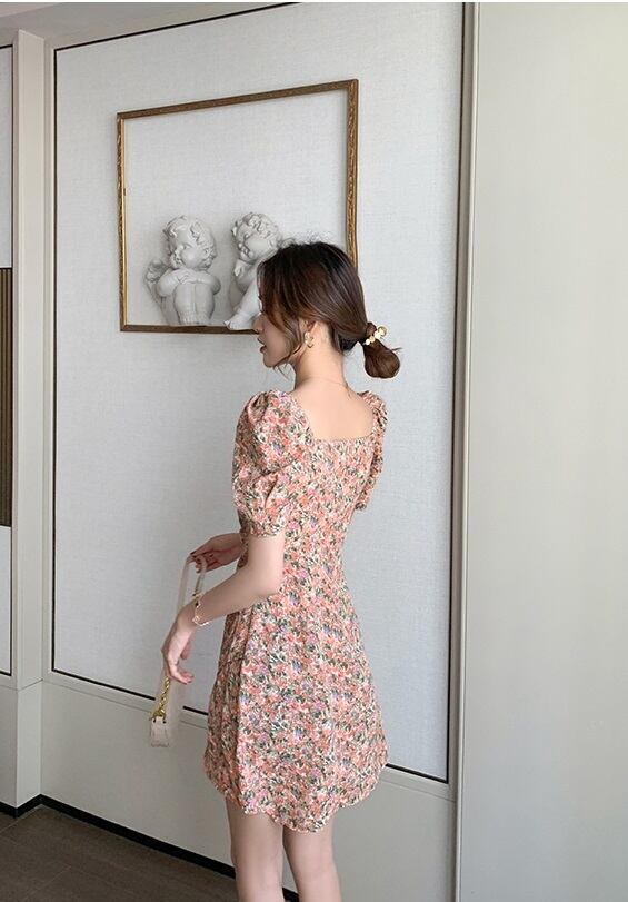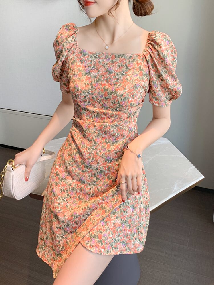 ミニワンピ 小花柄 半袖 レディース パワーショルダー スクエアネック 夏ワンピ ミニスカート 台形スカート 巻きスカート パフスリーブ かわいい おしゃれ トレンド レトロ感 花柄 総柄 オレンジ系 涼し気 夏服 大人女子 大人可愛い 10代 20代 30代 セクシー 通勤 通学 学生 旅行 休日 お出かけ 避暑地 リゾート ドライブ デート 夏休み 簡単コーデ 着まわせる お食事 女子会 海 プール 韓国ファッション オルチャン 可愛い 低価格 インポート お買い得 低価格 普段使い 着やすい