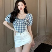 チェックブラウス レディース 半袖 パフスリーブ プルオーバー 青白チェック 総柄 サイドレースアップ 短め丈 ウエストライン スクエアネック 白ストラップ レースアップ 爽やか 夏服 半袖シャツ かわいい おしゃれ トレンド レトロ感 ティーンズ 女子ウケ おしゃれ女子 爽やかコーデ 着まわせる 夏休み デート 海 公園 旅行 リゾート インポート 海外デザイン フレンチシック プチプラ 韓国ファッション 低価格 お買い得 S M L 簡単コーデ 大人女子 大人可愛い 楽ちん 定番チェック レトロ