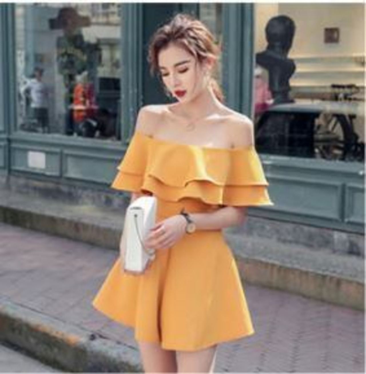 フリルのオフショルダーとハイウエストのショートパンツが