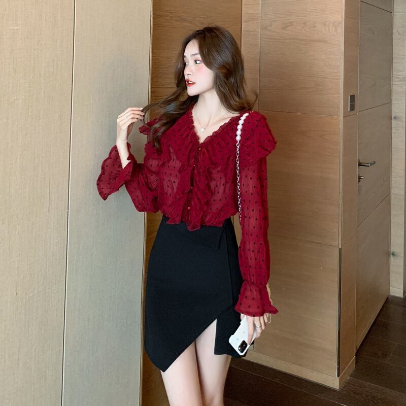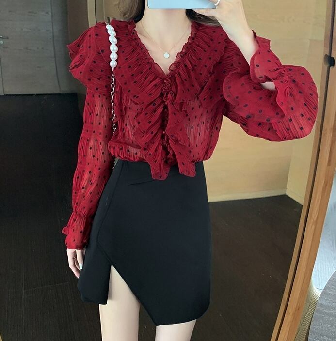 赤地に黒のドット模様のラッフルフリルデザインが華やかシフォンブラウス。