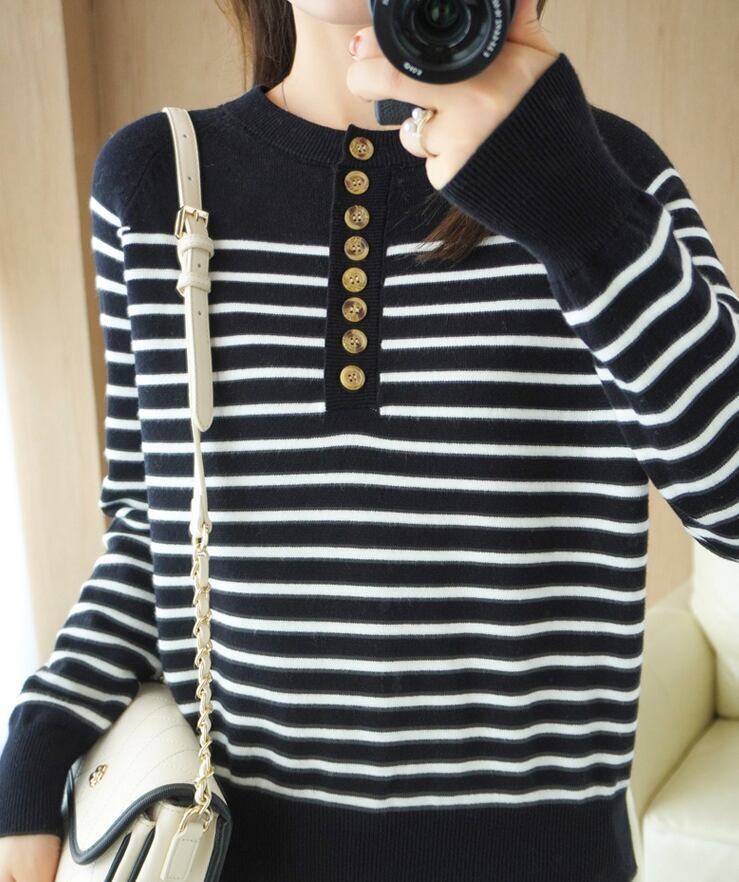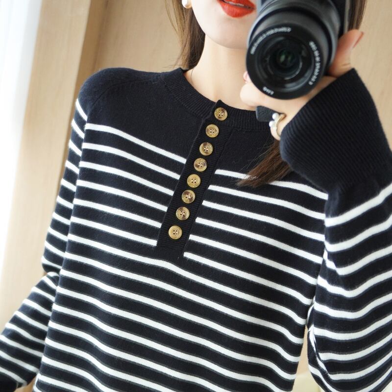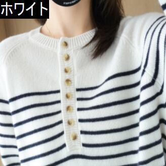ボーダーニット トップス ニットソー セーター 袖あり 長袖 ラウンドネック かわいい 大人可愛い きれいめ シンプル カジュアル 大人 上品 おしゃれ お洒落 レトロ 大人可愛い 大人女子 こなれ感 ラブリー キュート ガーリー 個性的 主役級 存在感 抜け感 柄 ボーダー 秋 冬 10代 20代 30代 レディース 学生 通学 デート お出かけ 公園デビュー 女子会 休日 着回し 普段使い 重ね着 韓国系 オルチャン サイズ S M L XL 2XL 3XL 色展開 白 ホワイト 黒 ブラック