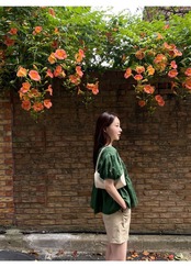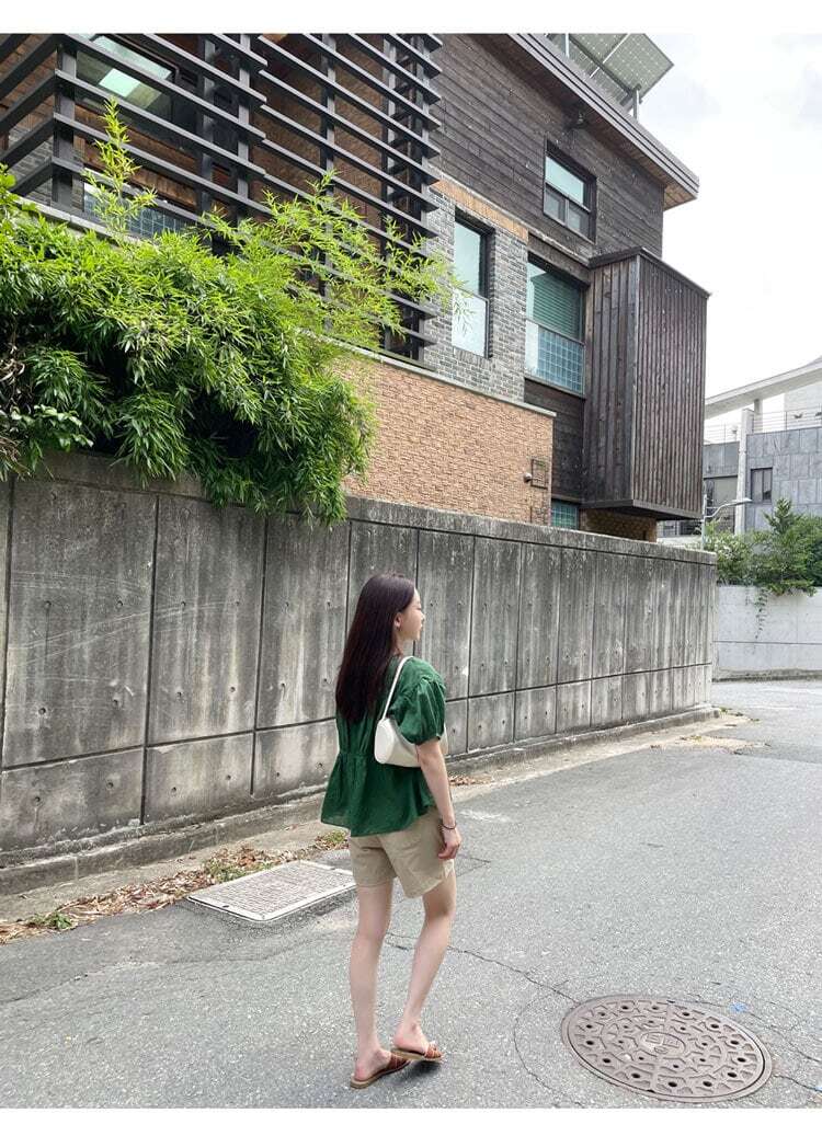 パフスリーブシャツ トップス シャツ ブラウス スイート フェミニン グリーン 緑 レギュラー丈 袖あり 長袖 ボリューム袖 パフスリーブ ラウンドネック シャーリング 人気シャツ デザイン良い 大人女子 大人 上品 おしゃれ デイリーウェア レトロ レトロ風 こなれ感 ルーズ シルエット ラフ キュート かわいい 女子 個性的 デザイン 主役級 存在感 無地 夏 サマー 20代 10代 30代 40代 レディース 女性用 学生 学校 通学 着回し 普段使い M L XL