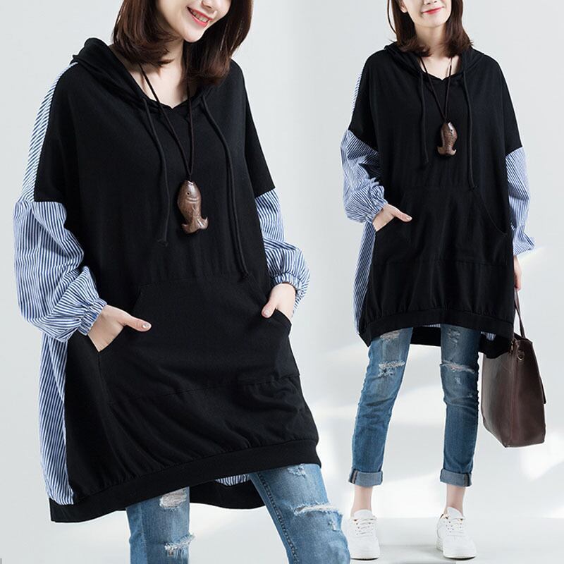 リバーシブル シャツ生地切替え ルーズシルエット オーバーサイズ トップス プルオーバー パーカー フーディー ロングチュニック ミディアム丈 膝上 長袖 ドロップショルダー 切り替えデザイン ポケット 綿 異素材MIX かわいい 大人可愛い シンプル カジュアル 上品 おしゃれ 個性的 存在感 無地 ボーダー シマ 春 秋 冬 レディース ママ マタニティ 学生 通学 お出かけ 休日 着回し 普段使い 重ね着 韓国系 体系カバー フリーサイズ 大きめ ビックサイズ ゆったり ゆる サイズ ブラック