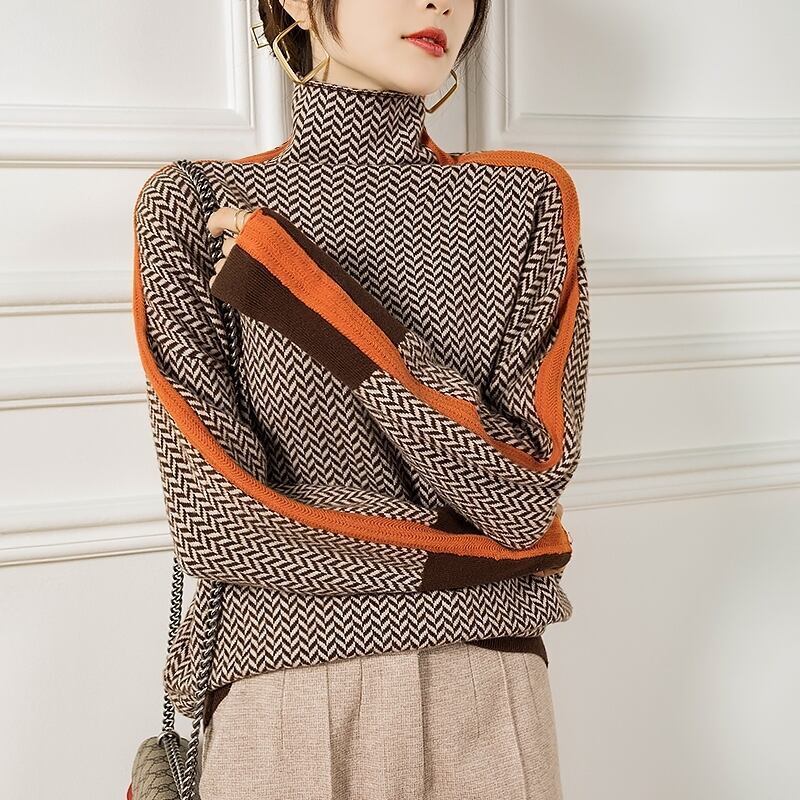 レトロデザインニット オーバーサイズ ヘリンボーン柄 配色ライン入り 袖口カラー 人気 ブロック トップス セーター ミディアム丈 袖あり 長袖 ドロップショルダー ハイネック ニット かわいい 大人可愛い きれいめ シンプル カジュアル 上品 レトロ おしゃれ お洒落 大人女子 こなれ感 春 秋 冬 レディース 女性用 ママ デート お出かけ 女子会 休日 着回し 普段使い 重ね着 韓国系 オルチャン ファッション コーデ 体系カバー 定番 S M L XL 大きめ ゆったり サイズ オレンジ グリーン