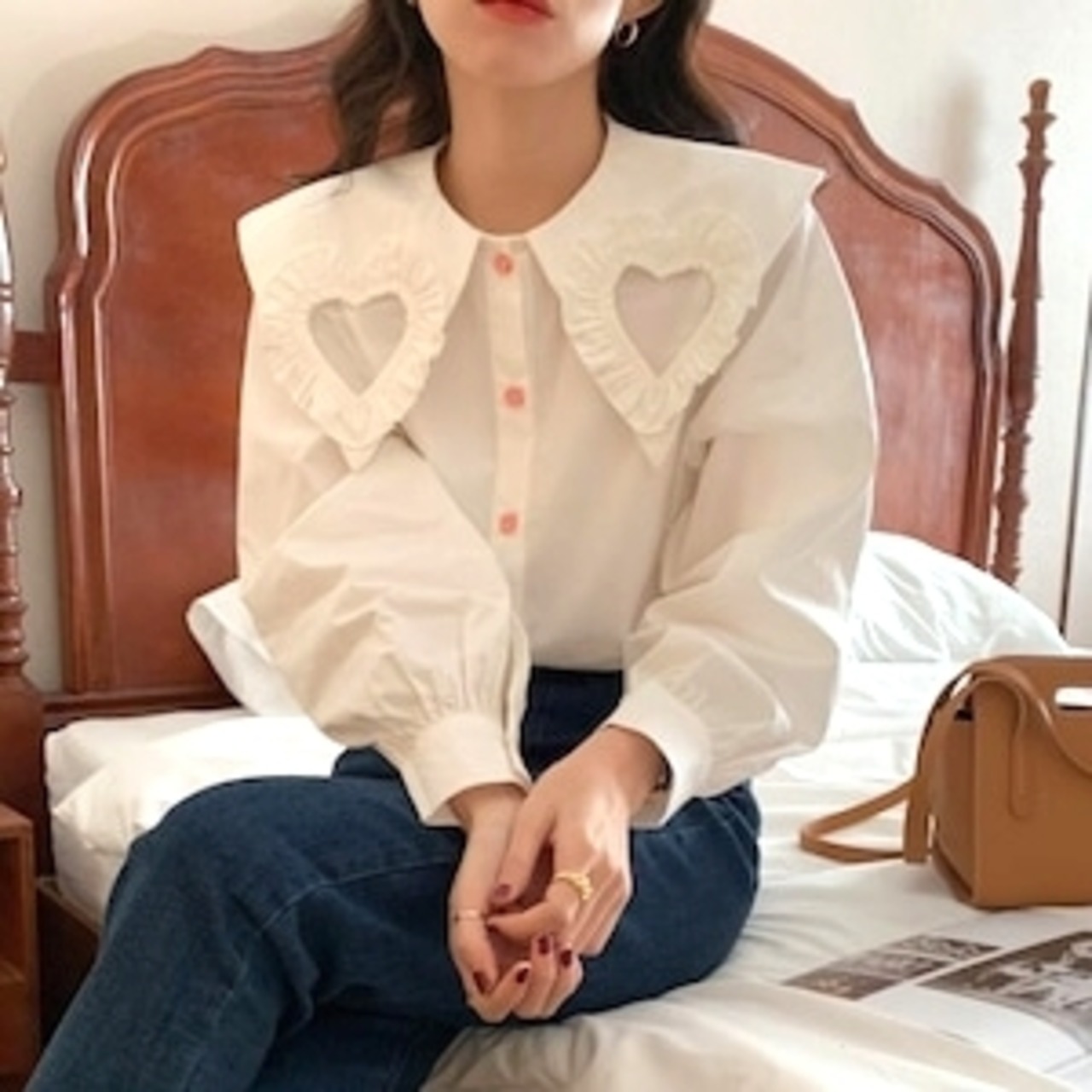 トップス ブラウス シャツ ハート型 ハートデザイン ホワイト ドール襟 大き目襟 長袖 フリル フロントボタン フリルハート トレンド 流行 トレンディ スタイリッシュ 外国風 デザインイン 外国ファッション 無地 大人女子 大人 上品 おしゃれ エレガント デイリーウェア レトロ風 こなれ感 キュート かわいい 女子 個性的 デザイン 主役級 存在感 春 スプリング 20代 10代 30代 レディース 女性用 オフィス ビジネス OL 通勤 学生 学校 通学 ファッション コーデ S M L XL