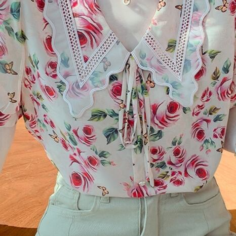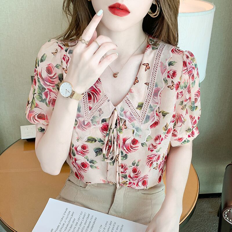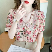 トップス レディース ブラウス 花柄 フラワープリント 花柄シャツ 半袖 夏物 パフスリーブ 萌袖 Vネック レース フリル 可愛い 大人可愛い きれいめ 上品 レトロ おしゃれ お洒落 かわいい 大人女子 ラブリー キュート ガーリー 個性的 清楚 華やか 存在感 主役級 ロリータ カジュアル S M L XL 2XL フラワー 春 夏 10代 20代 学生 通学 デート お出かけ 公園デビュー 女子会 イベント リゾート 旅行 着回し インスタ映え インポート お出かけ お呼ばれ モテ 萌え 人気