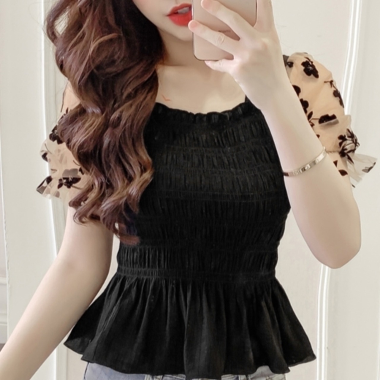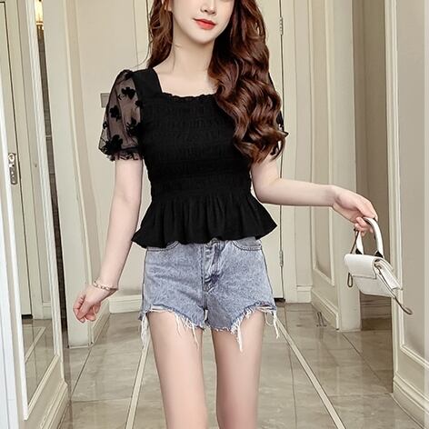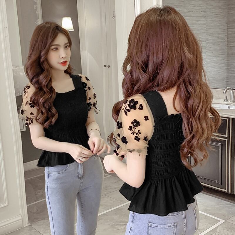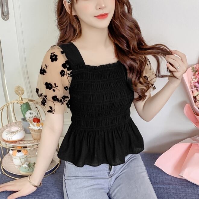 トップス ブラウス パフスリーブ シャツ シースルー 人気デザイン 袖メッシュ 花柄 フラワープリント ブラック アプリコット サマーファッション トレンディ トレンド 流行 外国風 メッシュ スクエアネック 2カラー パフスリーブブラウス シフォンシャツ レディース サマー 新しい スリムフィット ギャザリング 伸縮性 大人可愛い きれいめ シンプル 大人 アジアン こなれ感 爽やか ナチュラル お出かけ 着回し 普段使い ファッション コーデ スタイル 楽ちん プレゼント ギフト 定番 プチプラ